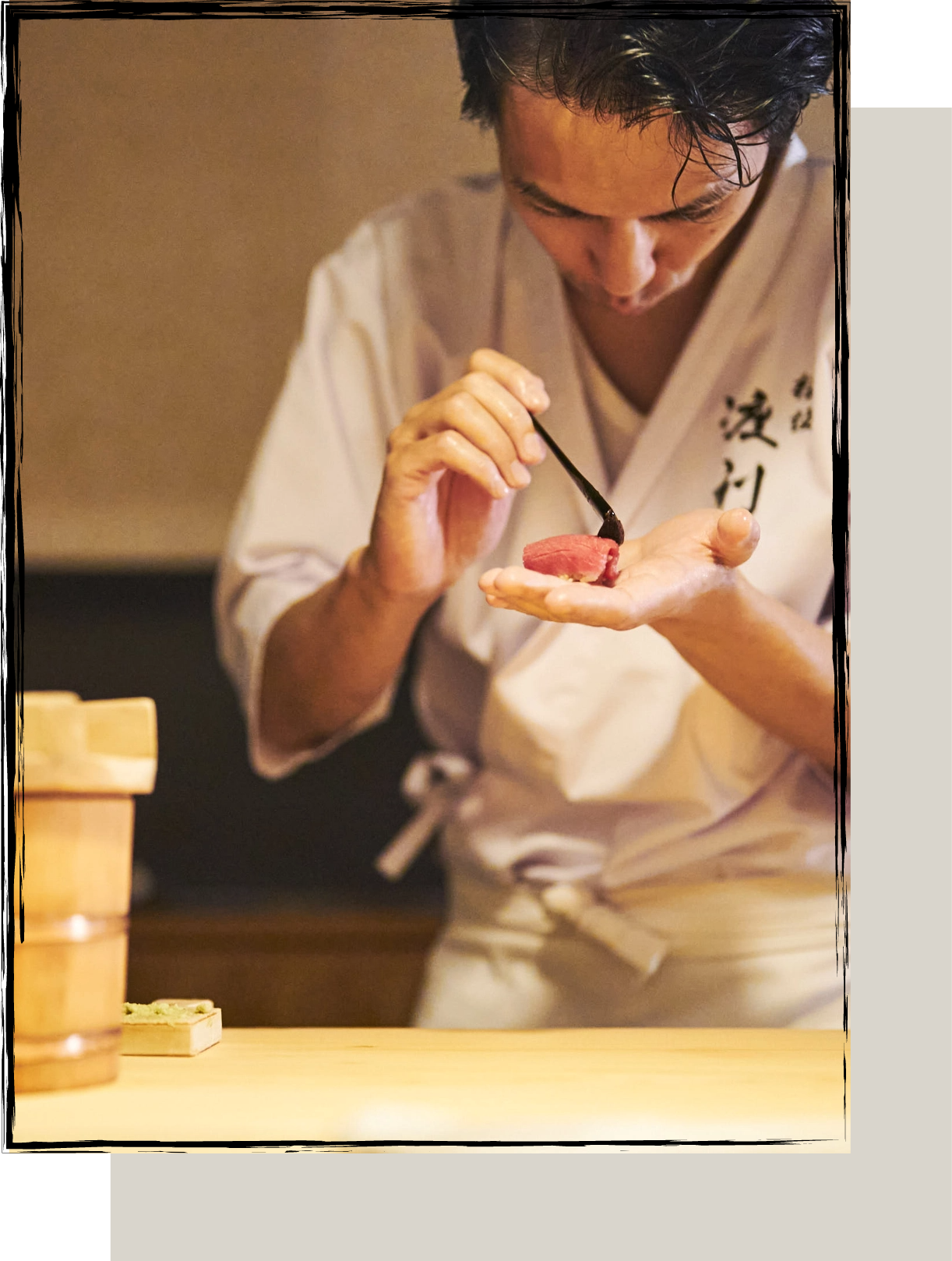 首都大学東京(現東京都立大学) 理工学部で学ぶ傍らアルバイトを通して鮨に興味を持ち、神楽坂・銀座の鮨店で7年間修行。